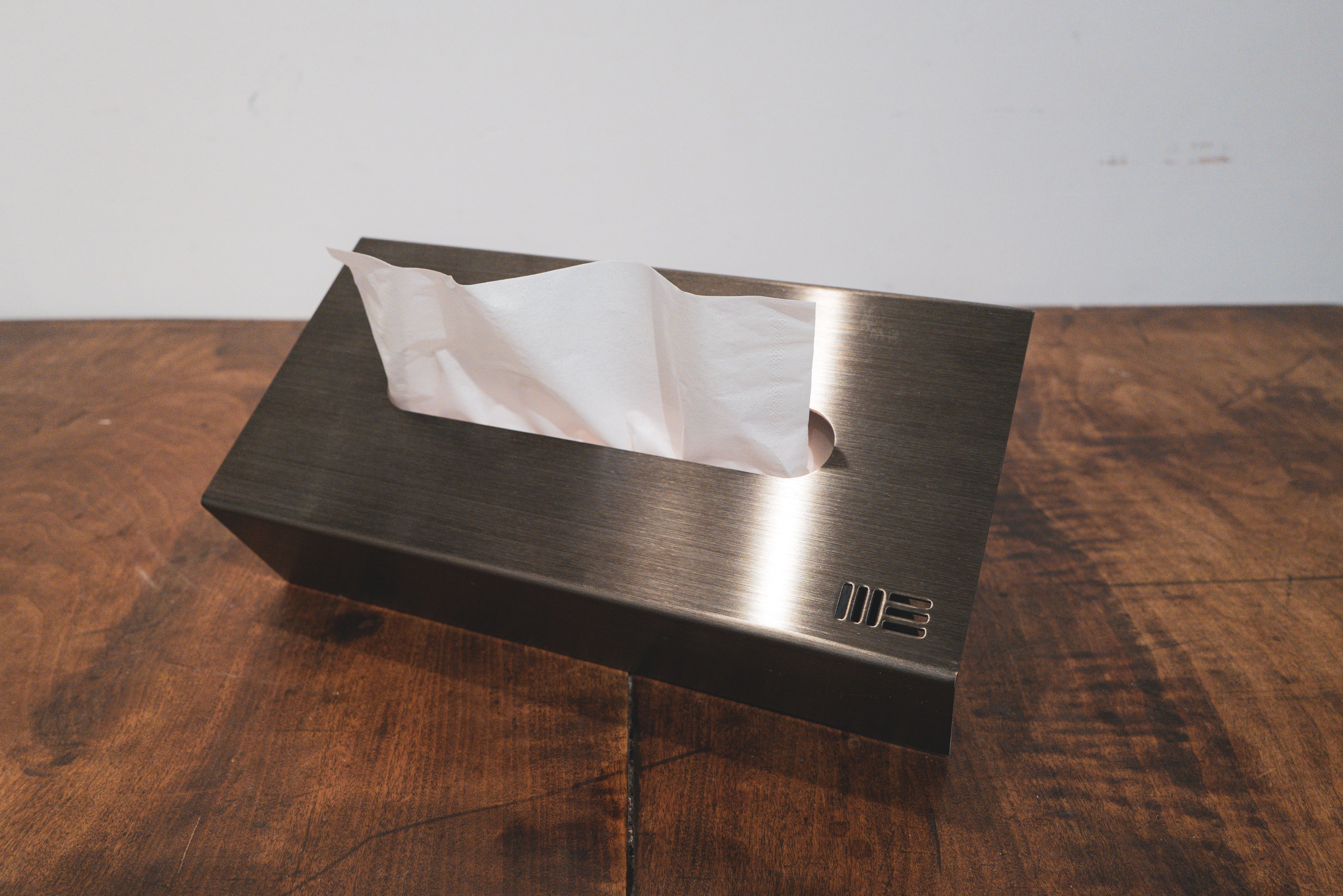 生活感を抑えるブラックヘアライン仕上げのステンレスが上品さと重厚感をプラス。安定感のある重量で、使い勝手にも優れたティッシュボックスです。