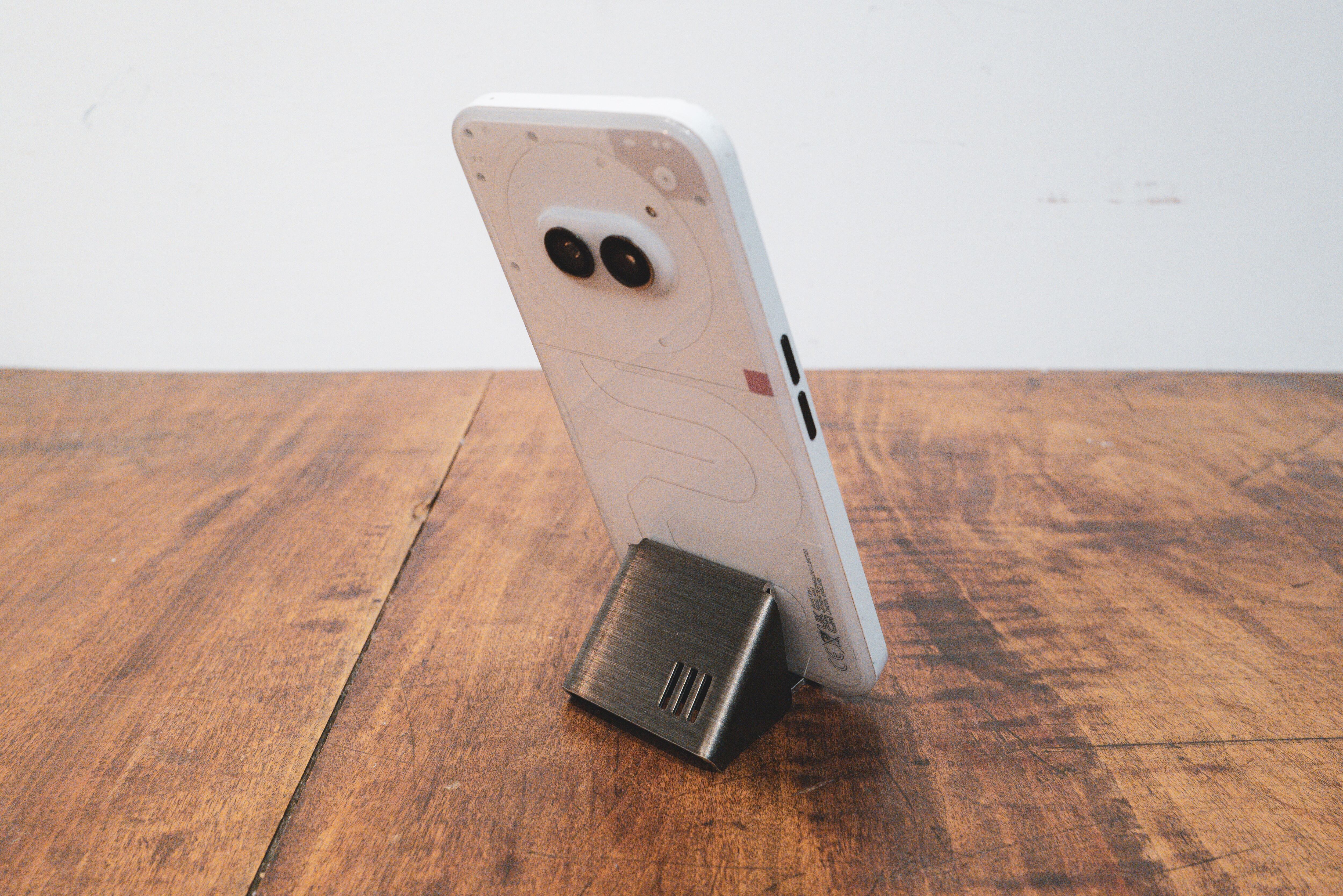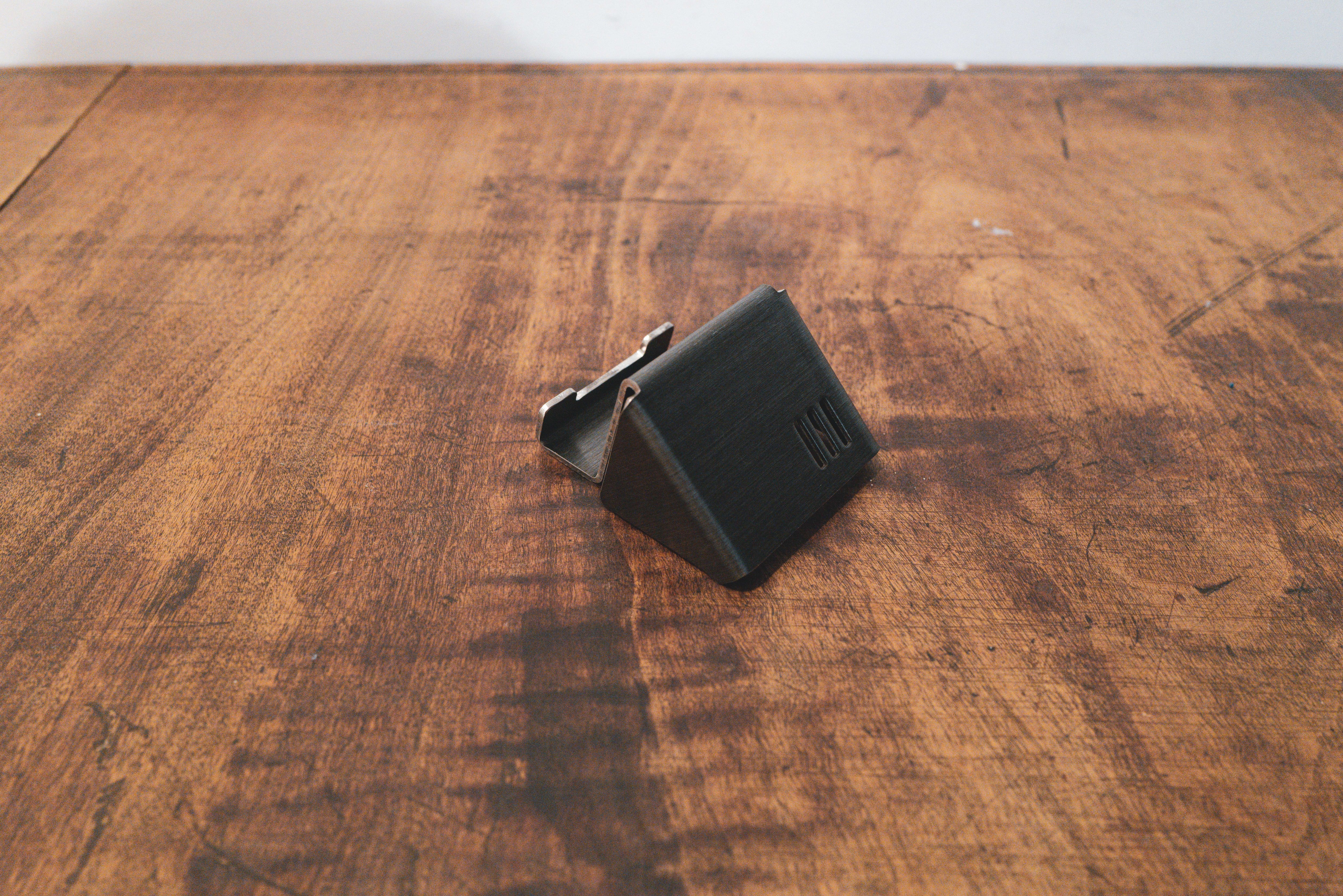 生活感を抑えるブラックヘアライン仕上げのステンレスが上品さと重厚感をプラス。コンパクトで場所を取らないステンレス製のスマホスタンドです。
