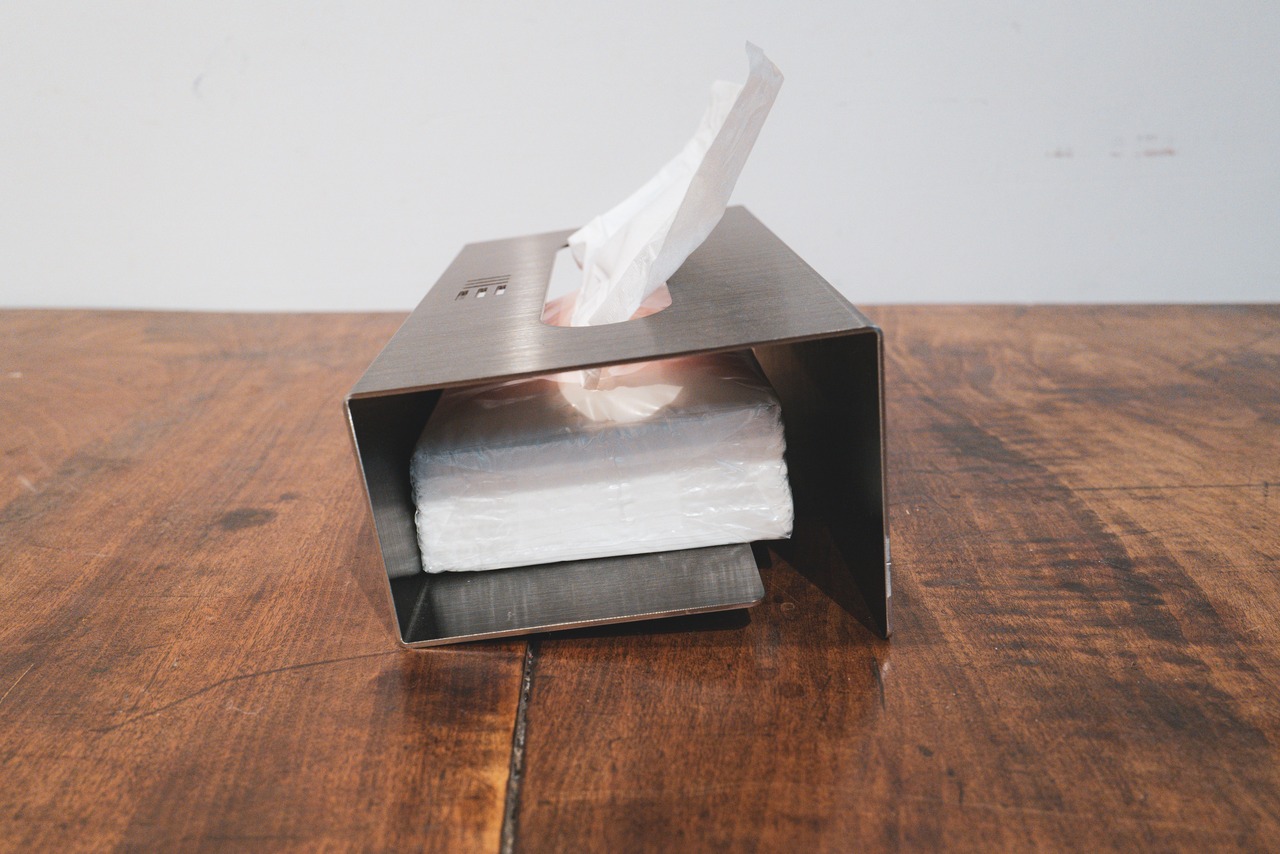生活感を抑えるブラックヘアライン仕上げのステンレスが上品さと重厚感をプラス。安定感のある重量で、使い勝手にも優れたティッシュボックスです。