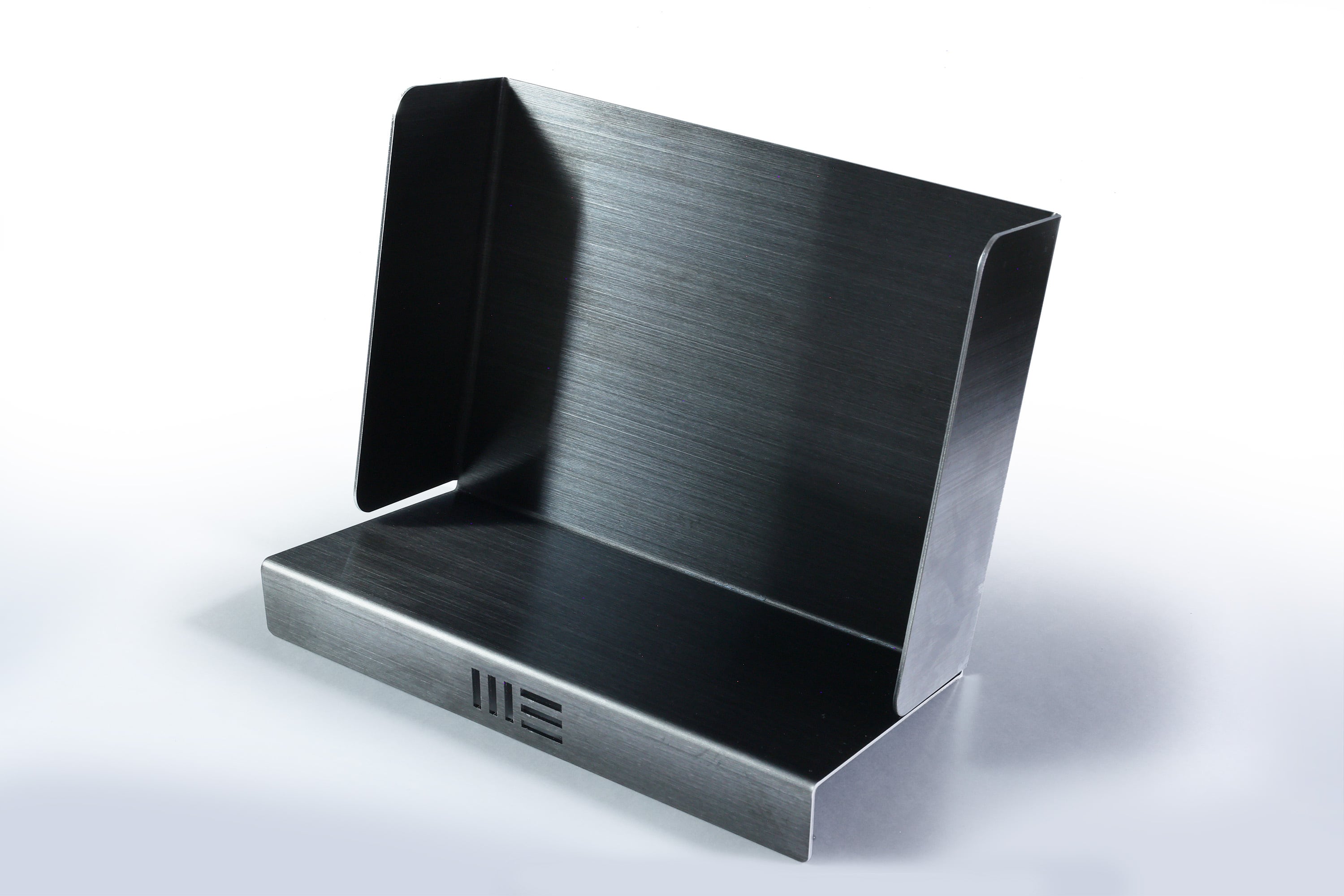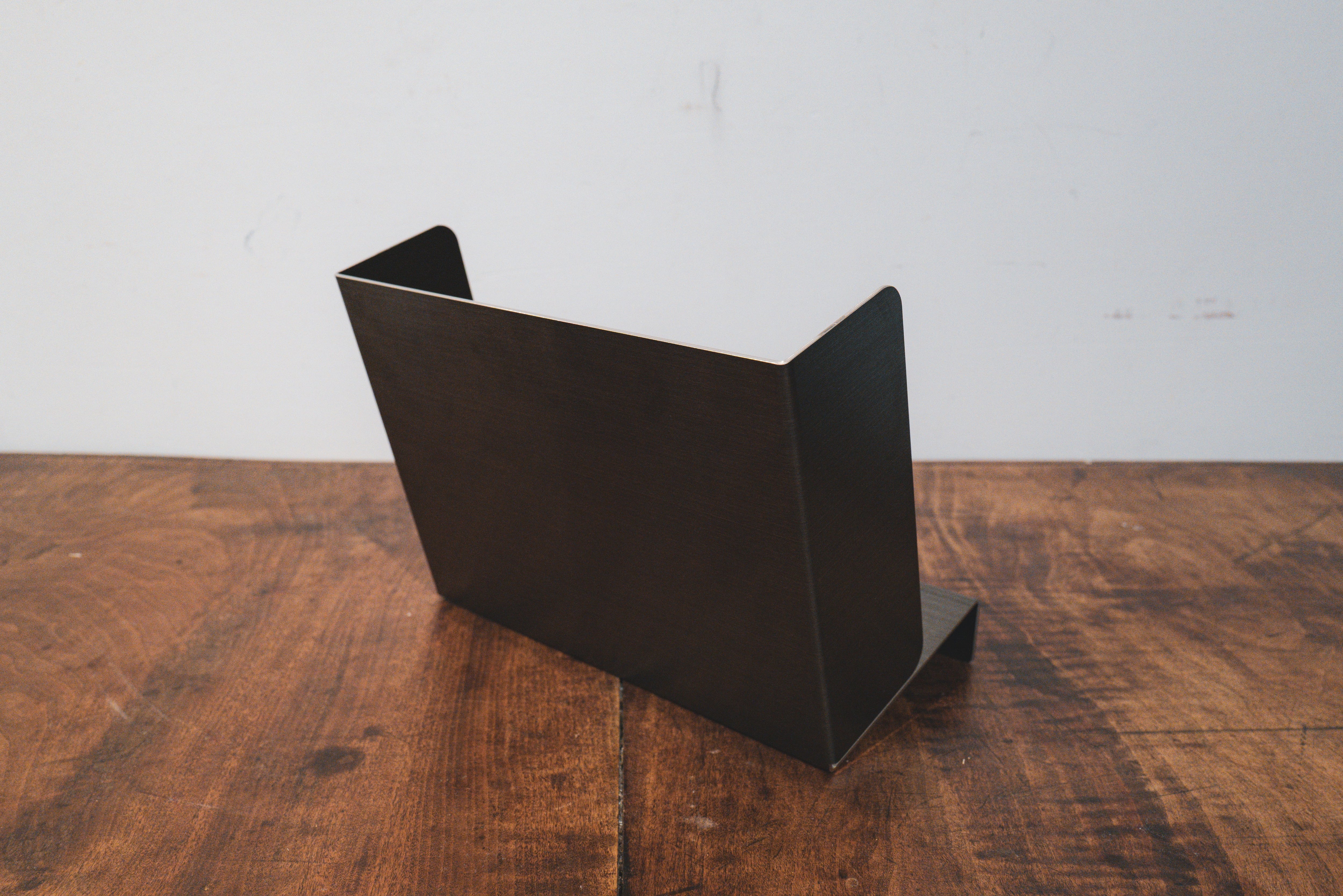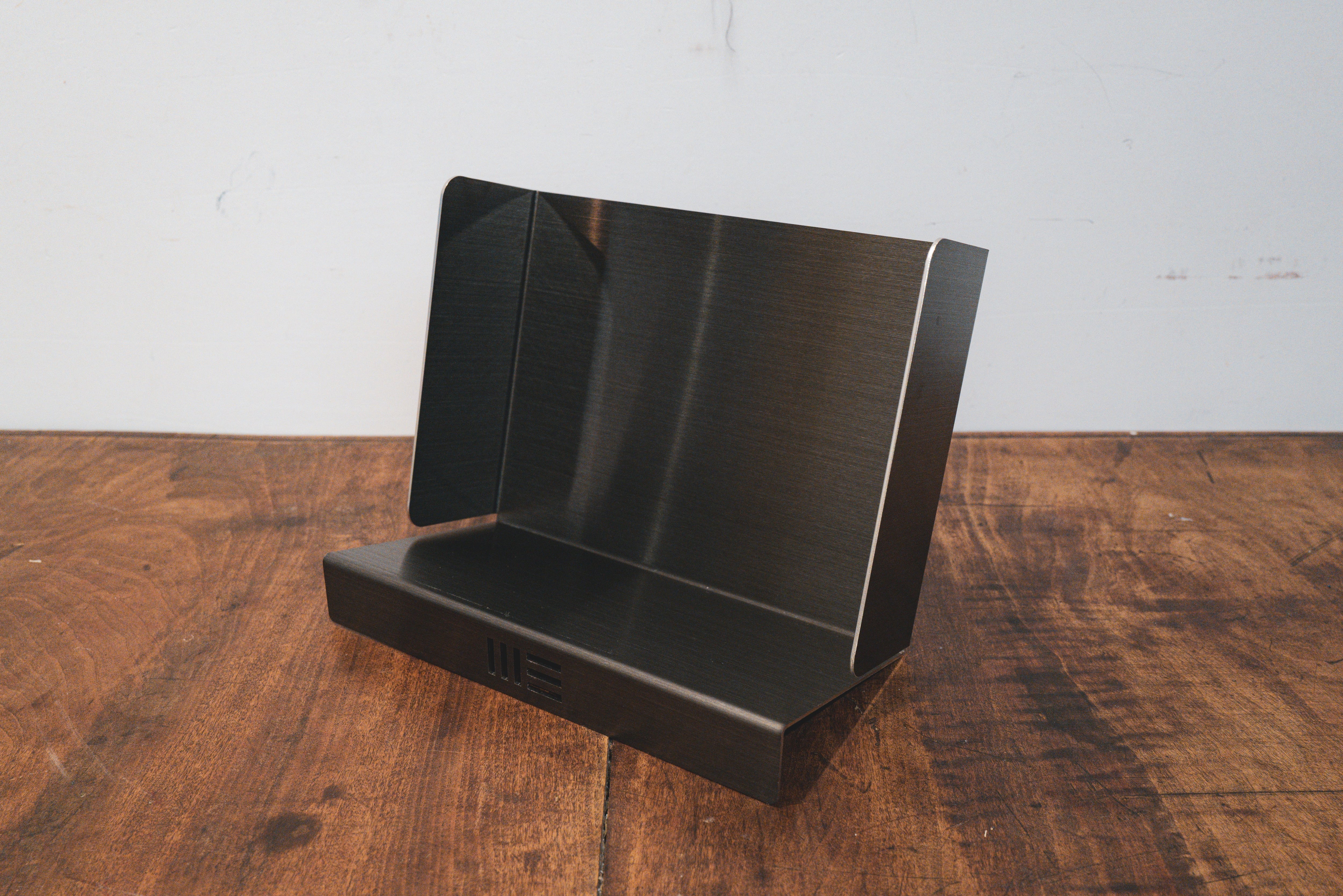 生活感を抑えるブラックヘアライン仕上げのステンレスが上品さと重厚感をプラス。デスク上の本を8~10冊ほど並べることができます。